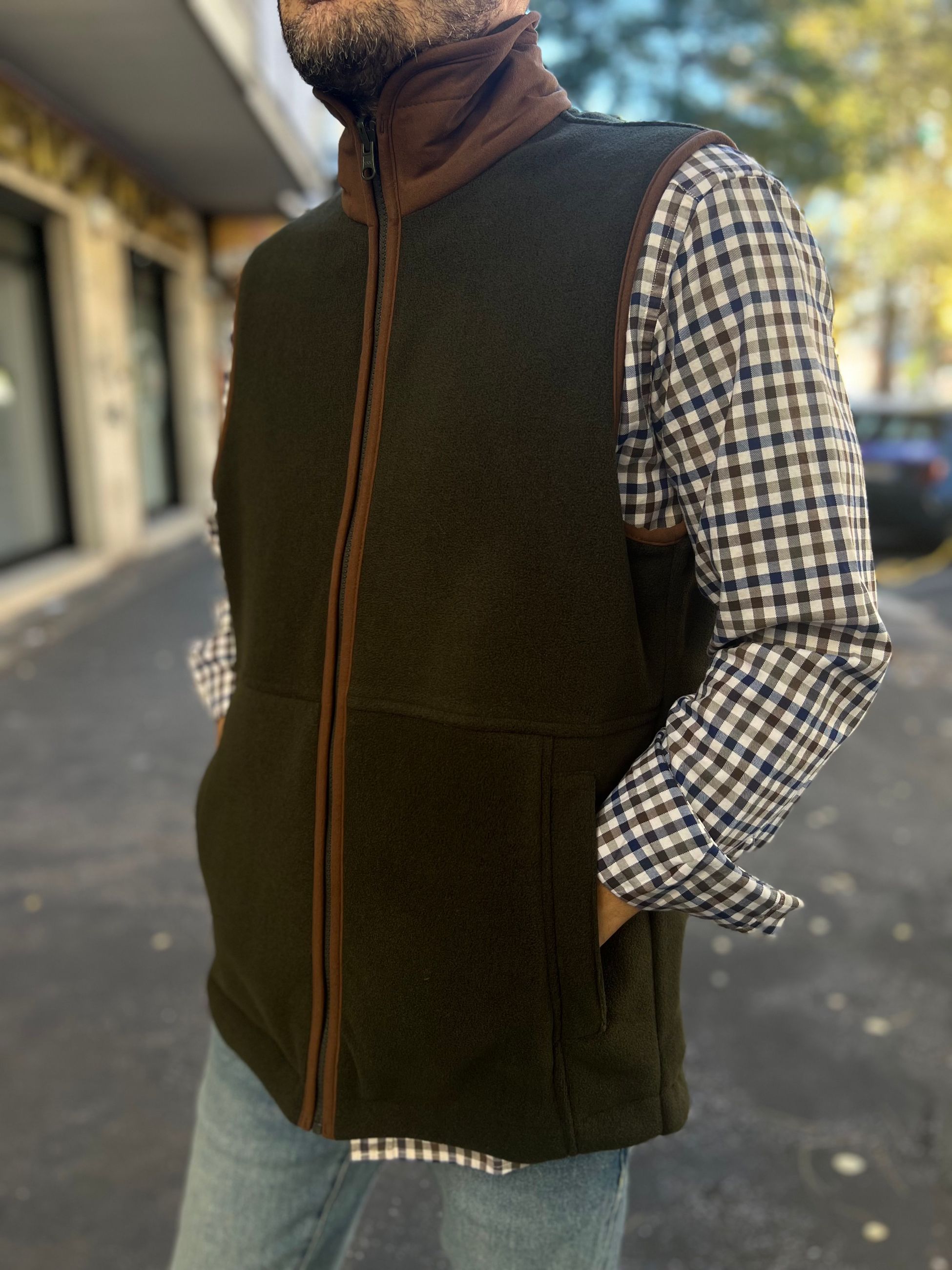 Smanicato in pile con inserti in ecopelle, ideale da indossare sopra una camicia, o come strato aggiuntivo sotto un cappotto.
